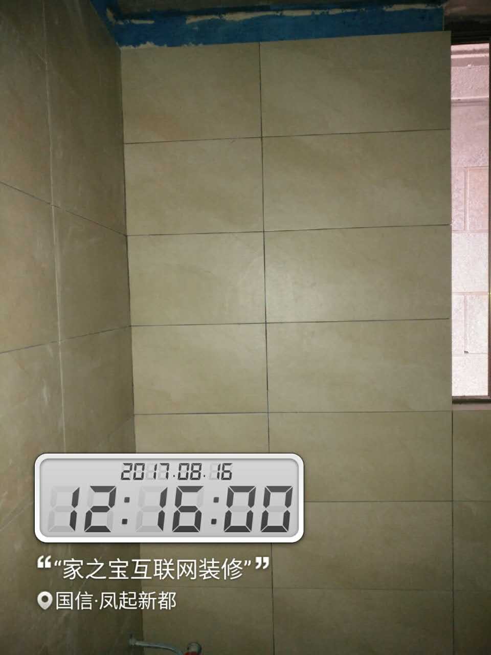 墻磚鋪貼,使用水平儀投射水平線,陽角處采用磨邊45°碰角工藝。